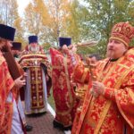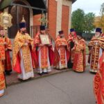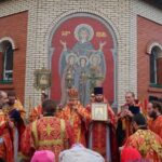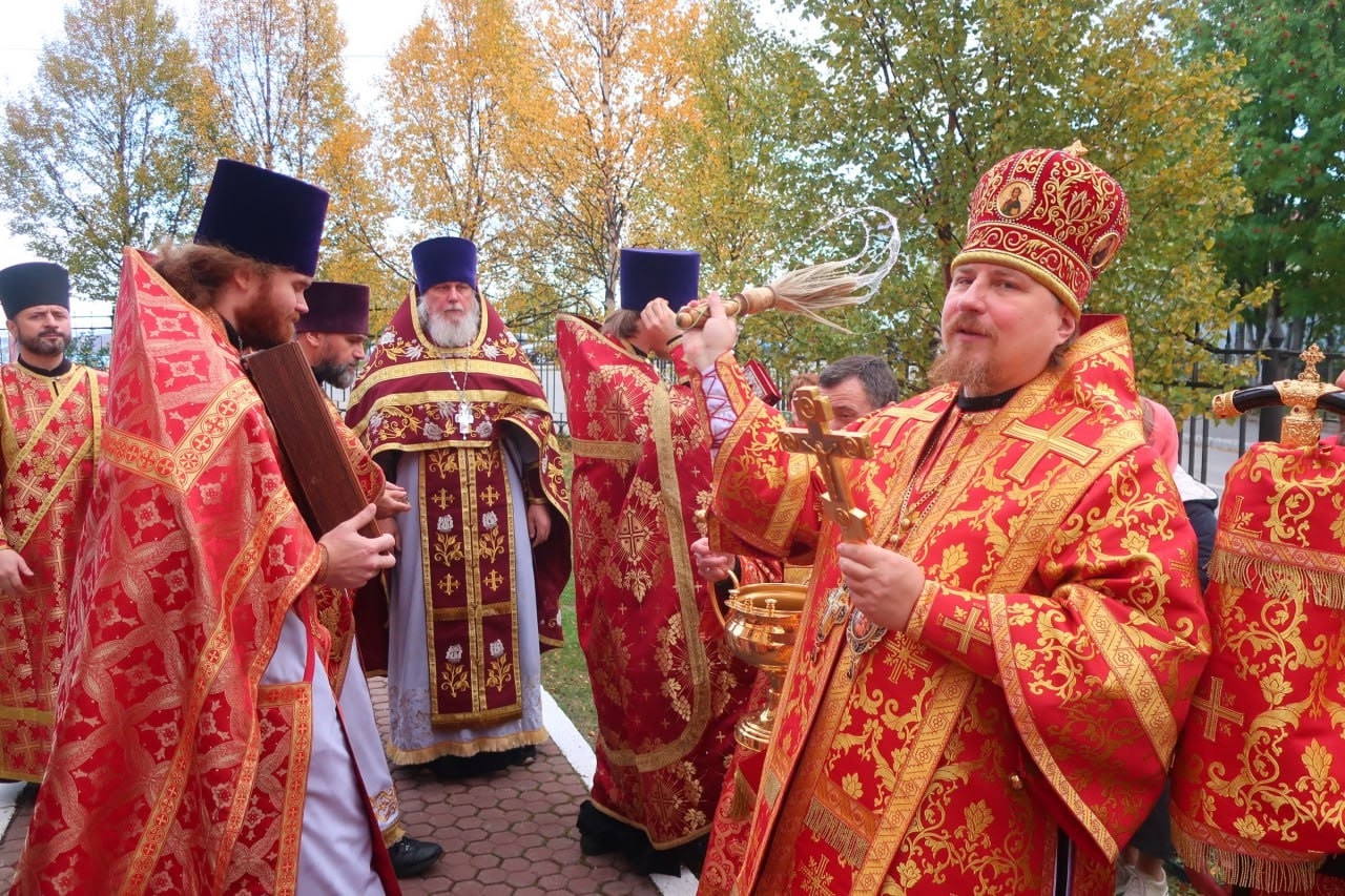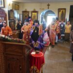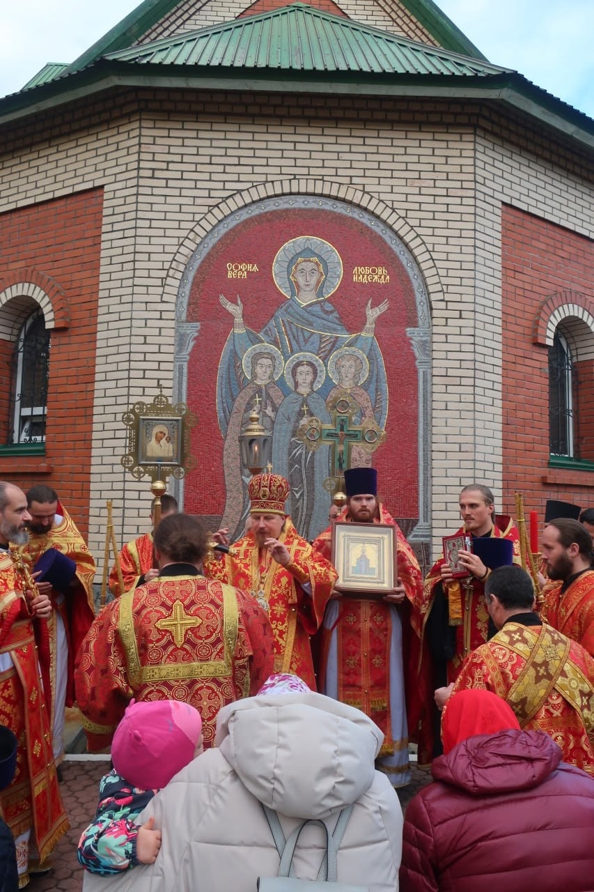 В конце богослужения правящий архиерей возглавил крестный ход и славление, за которым вознес молитву свв. мцц. Вере, Надежде, Любови и матери их Софии и совершил троекратное поклонение Честному Кресту.