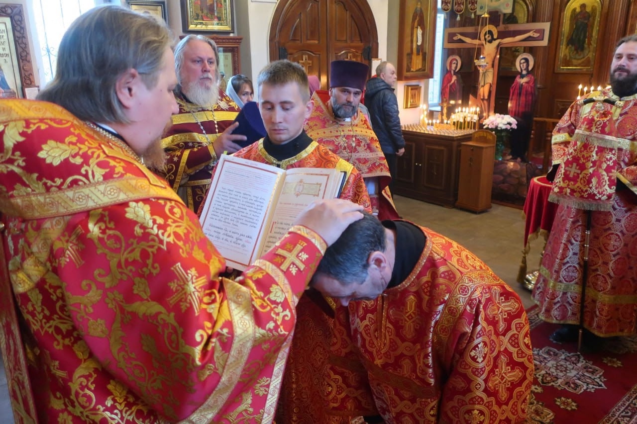 Димитрий Баданин, иеродиакон Феодорит (Линков), иподиаконы Роман Мухаметов, Георгий Бурцев и Антоний Гапеев. Накануне в этом же храме владыка совершил всенощное бдение.