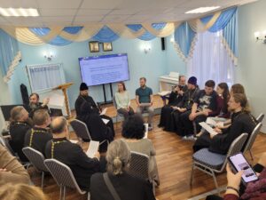 Во второй части мероприятия участники в формате практического занятия попробовали себя в роли членов приходской библейской группы. Вместе они разобрали евангельский отрывок – притчу о талантах (Мф. 25:14–30). В ходе обсуждения рассматривались толкования святых отцов, а также различные смысловые варианты евангельского отрывка. Такой формат позволил участникам на практике увидеть, каким образом может проходить живая встреча библейской группы и вдохновил на организацию подобных встреч на своих приходах.