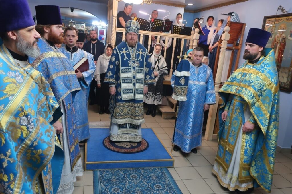 В окончании богослужения Его Преосвященство возглавил славление, за которым вознес молитву Божией Матери. По отпусте и благодарственным молитвам по причащении владыка поздравил духовенство и прихожан с престольным праздником, а также с принятием Святых Христовых Тайн и напутствовал всех добрым словом.