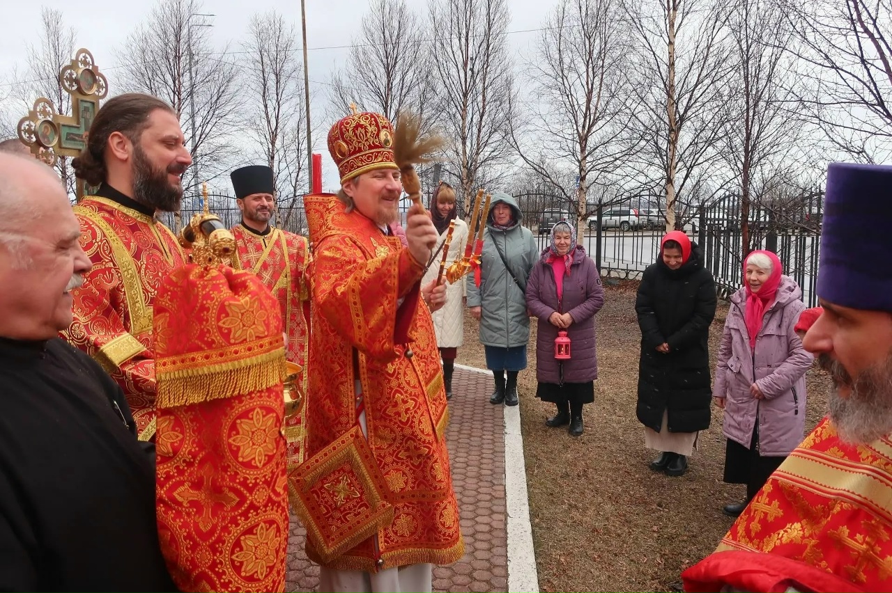 В окончании богослужения правящий архиерей совершил малое освящение воды и возглавил крестный ход. По отпусте и благодарственным молитвам по Святом Причащении Его Преосвященство обратился с архипастырским словом к молящимся, после чего поздравил духовенство и верующих с праздником Светлой Пасхи, провозгласив: «Христос воскресе!»